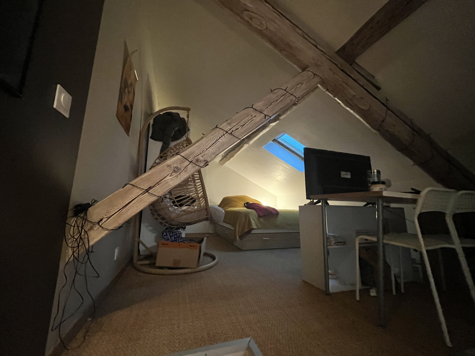 - Chambre : Une magnifique chambre mansardée avec poutres apparentes, pour une ambiance cosy et chaleureuse.