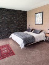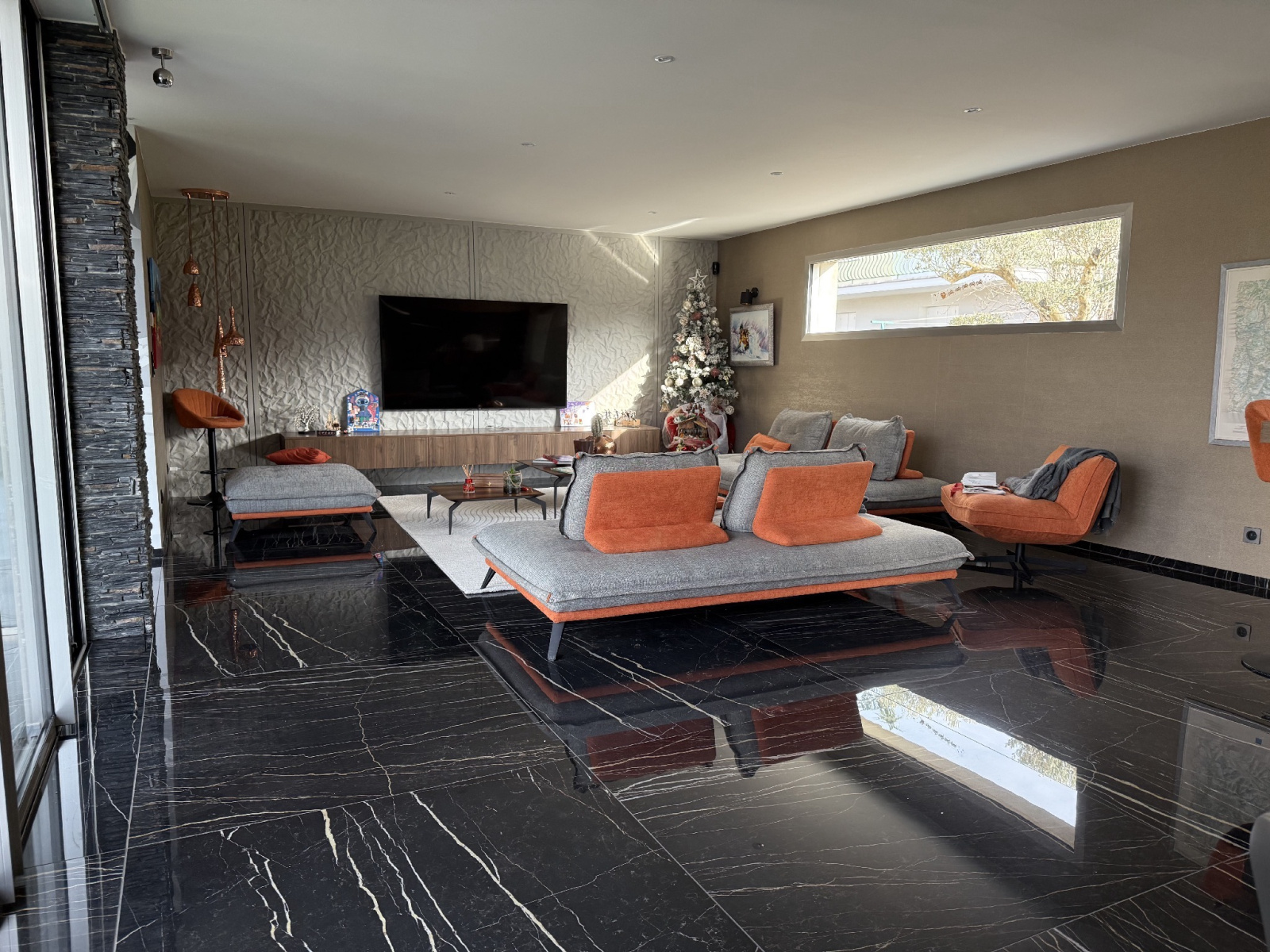 Carrelage intérieur/extérieur uniforme, mur en pierre intérieur/extérieur, chauffage au sol, sous-sol de 71 m², abri voiture.