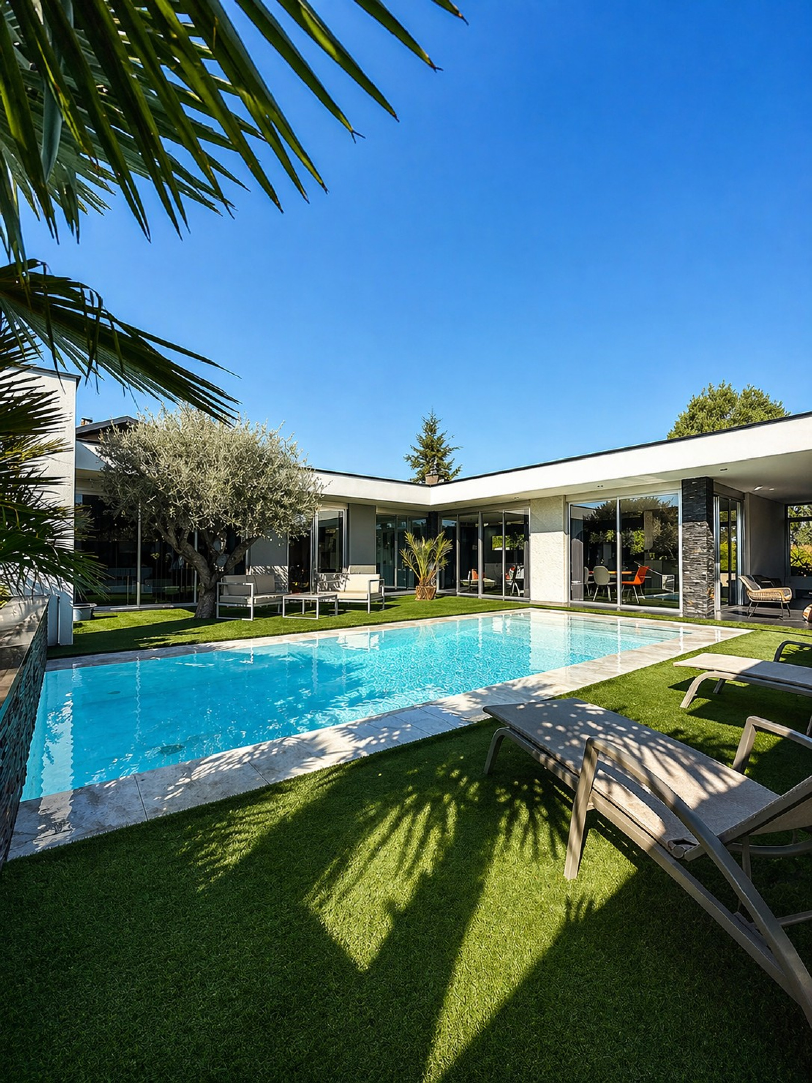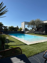 L’ensemble s’ouvre sur un extérieur exceptionnel, pensé comme un véritable prolongement de la maison : une piscine miroir 8x3 m avec balnéo, cascade et volet immergé, un jardin paysagé aux essences méditerranéennes, ainsi qu’un élégant patio de 24 m², idéal pour profiter de moments privilégiés.